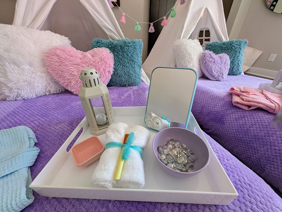 Imagine stepping into your very own cozy tent and finding a special spa station just for you. We provide everything you need for the perfect pamper session. Just add your favorite lotions, face masks, and nail polish, and we'll handle the rest!